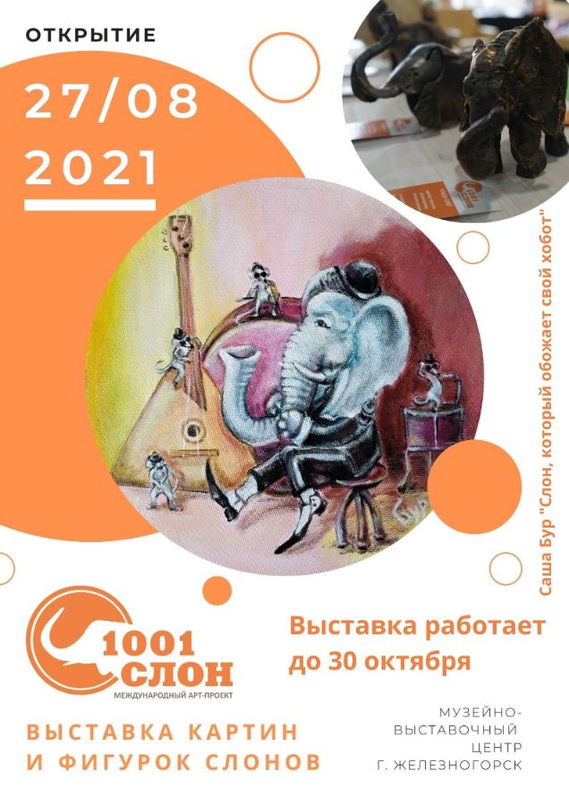 В музейно-выставочном центре Железногорска (Красноярский край) откроется выставка картин и фигурок слонов арт-проекта. Живописные работы будут собраны в арт-композицию в виде слона. Открытие состоится 27 сентября в 16-00. Вход сободный.
